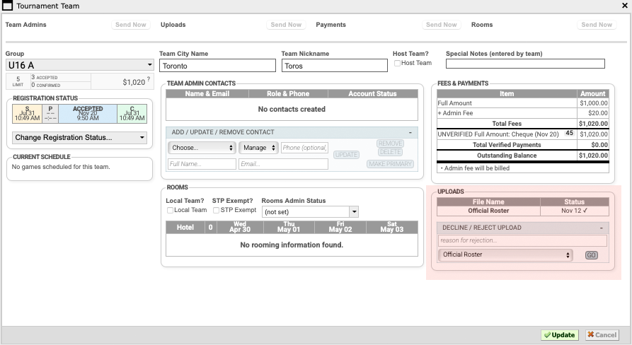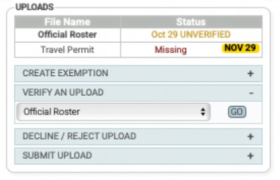 Verify a Document Upload: For document(s) uploaded by teams, but not yet verified by tournament organizers, click on the file name to view the document. If correct, choose the file in the Verify An Upload drop-down and click the GO button.