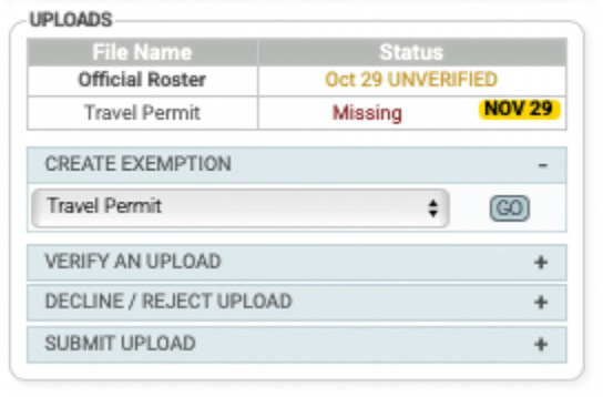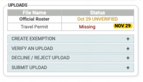 In the Uploads section, the required documents and their due-date (Status) are listed along with a set of management tools below the files. These tools include; Create Exemption, Verify an Upload, Decline / Reject an Upload and Submit an Upload. CLICK THE + to expand the tool options.