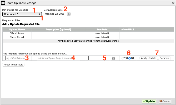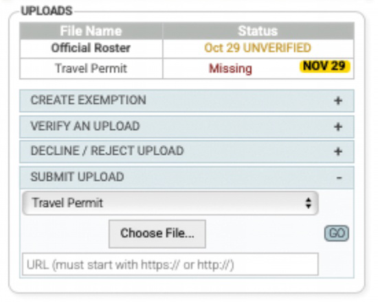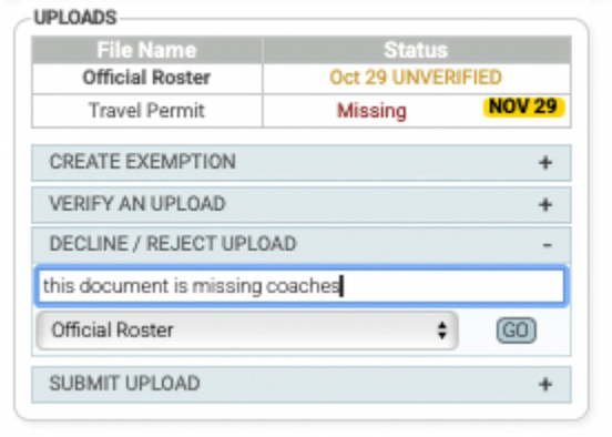 Upload on Behalf of the team: Should the team not use their team self-management portal to upload the document and send by email, the Tournament Administrator can upload on behalf of the team. In the Submit Upload drop-down, select the file and click the GO button to add.