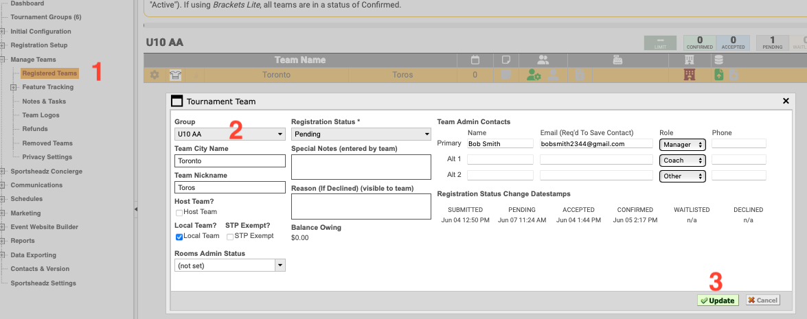 - In Brackets, navigate to Manage Teams—>Registered Teams and double-click on the team you want to update
