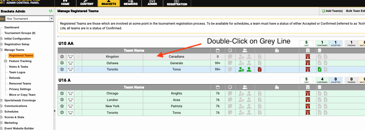 Manually accepting a team is simple. In Brackets, navigate to Manage Teams —> Registered Teams. With the list of teams, double click on the specific Team Name (grey line = Pending).