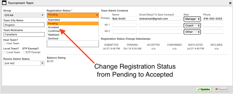 Change the registration status to "Accepted" or "Declined". If you are declining the team, add a reason in the window. Click Update to change the team's status.
