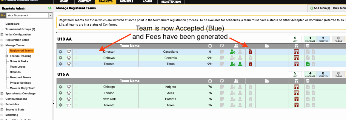 The team is now accepted (in Blue) and fees have been generated for this team. The team's Admin(s) will receive an Acceptance email from Brackets.