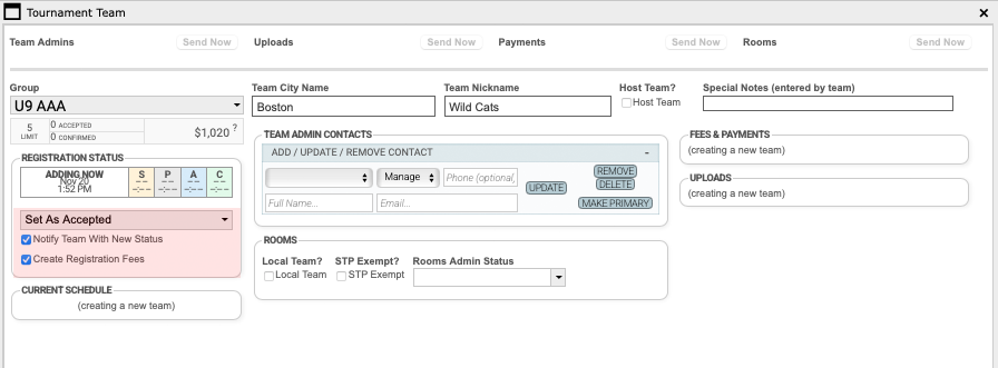 - If you are manually adding your home teams and they will not be paying through Brackets, do not mark them as “Accepted.” Instead, add them as “Confirmed” teams. This will prevent tournament fees from being generated.