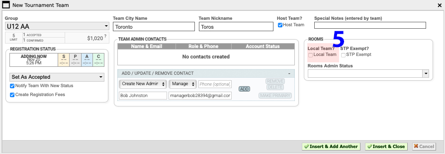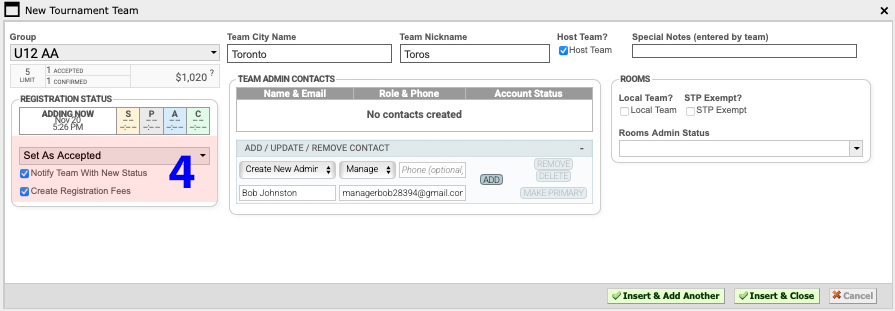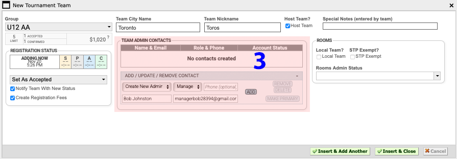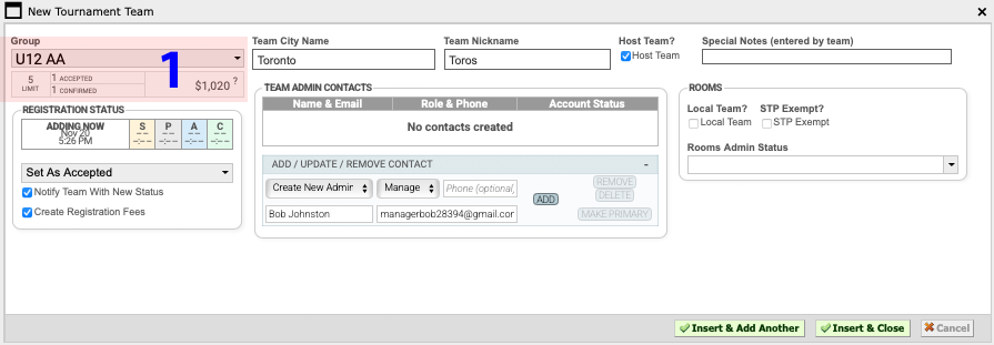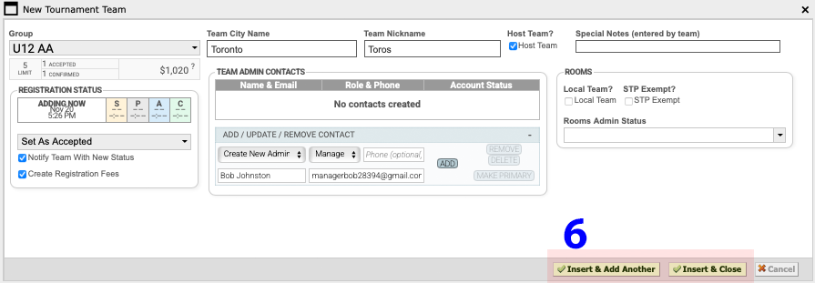 6 Click "Insert & Add Another" or Insert & Close" to add the team.